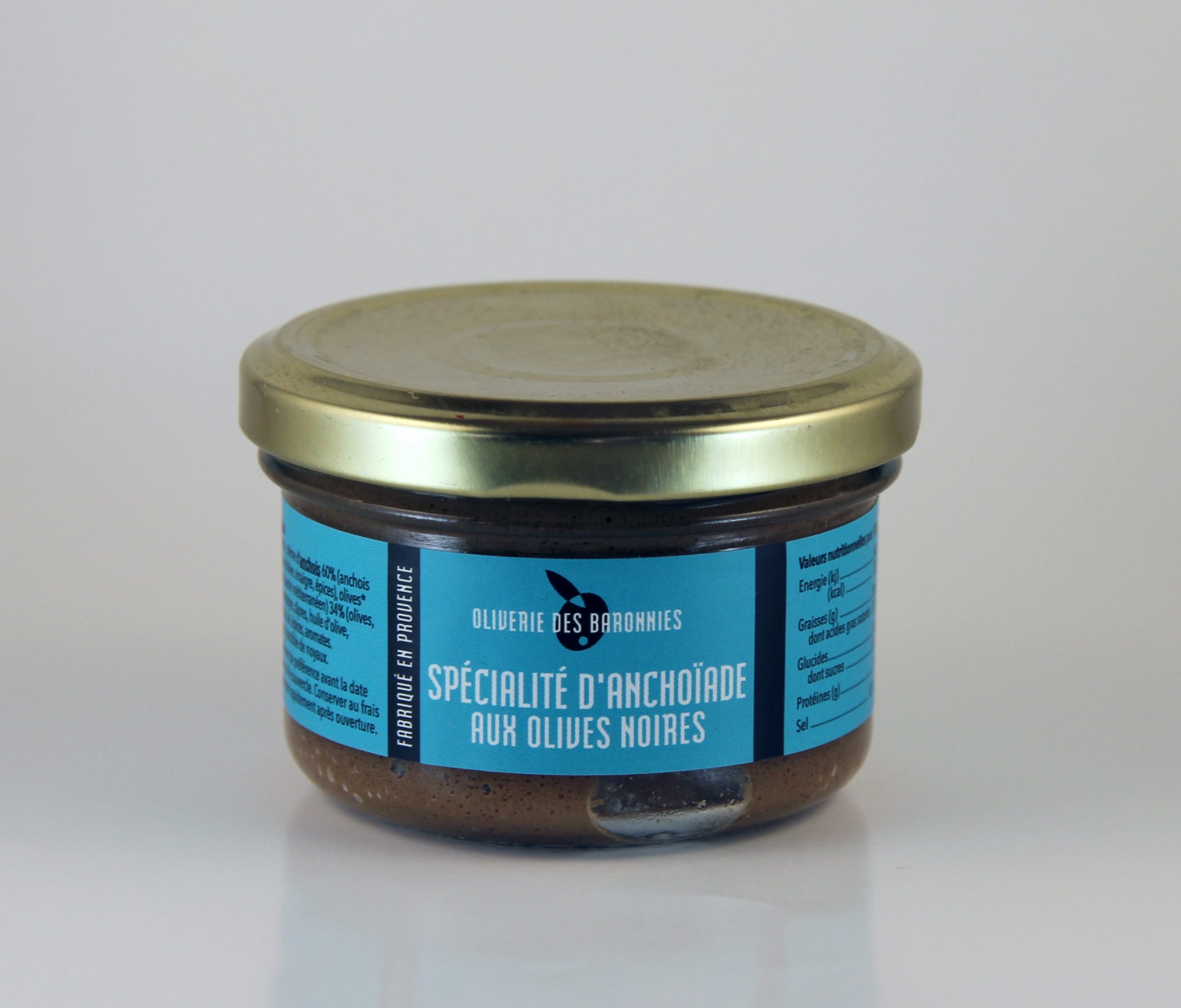 Pulpe d’olives noires du Bassin Méditerranéen 52% (olives, eau, sel), crème d’anchois 40% (anchois salés, huile d’olive), vinaigre, dextrose, ail, épices.